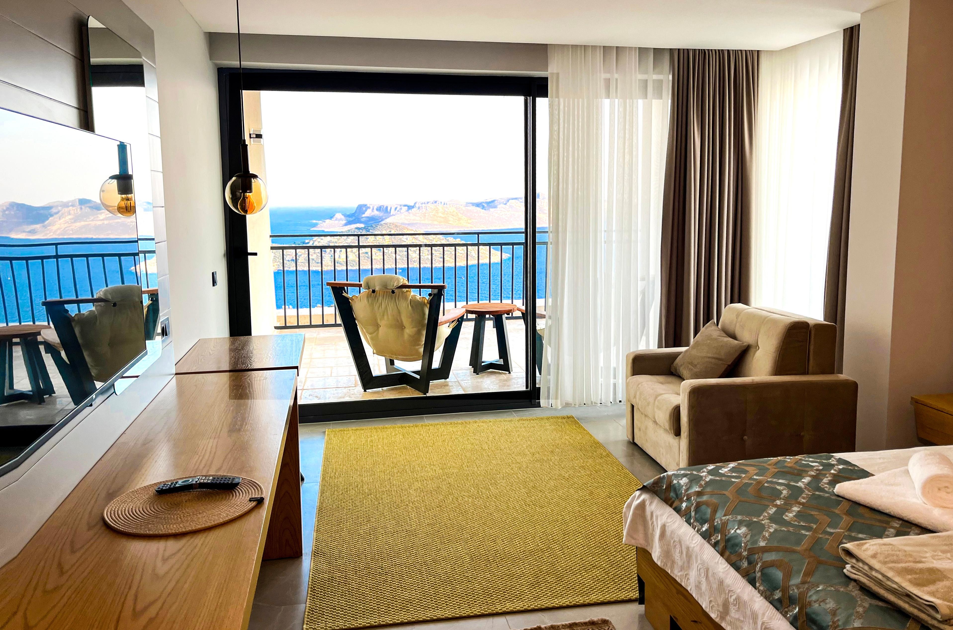 Kaş’ın büyüleyici manzarasını ayaklarınızın altına seren Deluxe Odamız, geniş balkonuyla hem panoramik deniz hem de havuz manzarası sunuyor. Lüks detaylarla donatılmış bu odada, sonsuzluk havuzunu ve Akdeniz’in masmavi sularını izlerken huzurun keyfini çıkarabilirsiniz. Modern konforu, doğanın eşsiz güzellikleriyle buluşturan bu özel oda, unutulmaz bir tatil deneyimi yaşatmak için sizi bekliyor.